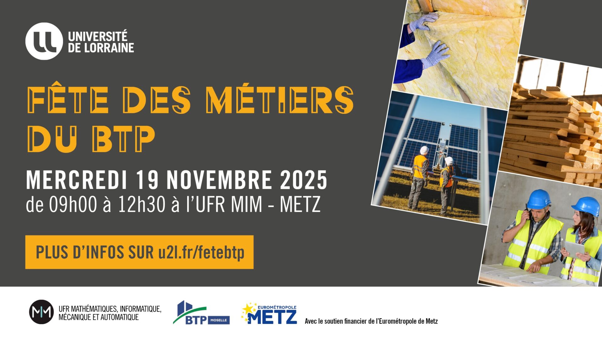 Que vous soyez diplômé, étudiant dans une filière en lien avec le BTP ou désireux de vous réorienter, cette manifestation, co-organisée par l’Université de Lorraine, la Fédération du BTP-Moselle et avec le soutien de l’Eurométropole de Metz s’adresse à vous !