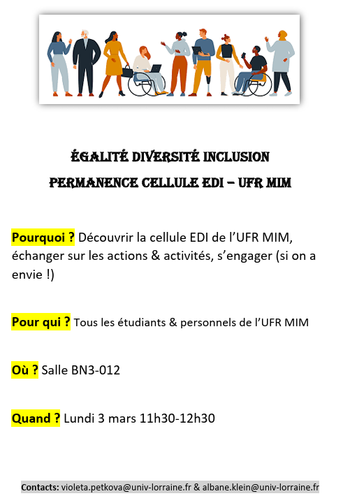 2ème permanence EDI à l’UFRMIM: venez nous rencontrer et posez vos questions le mardi 1er avril de 11h30 à 12h30! Quelques minutes suffisent pour prendre contact et découvrir la cellule