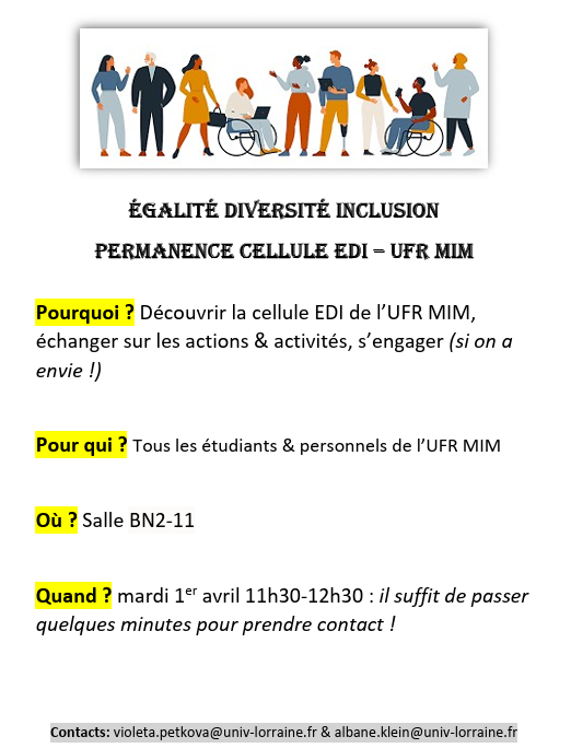 2ème permanence EDI à l’UFRMIM: venez nous rencontrer et posez vos questions le mardi 1er avril de 11h30 à 12h30! Quelques minutes suffisent pour prendre contact et découvrir la cellule
