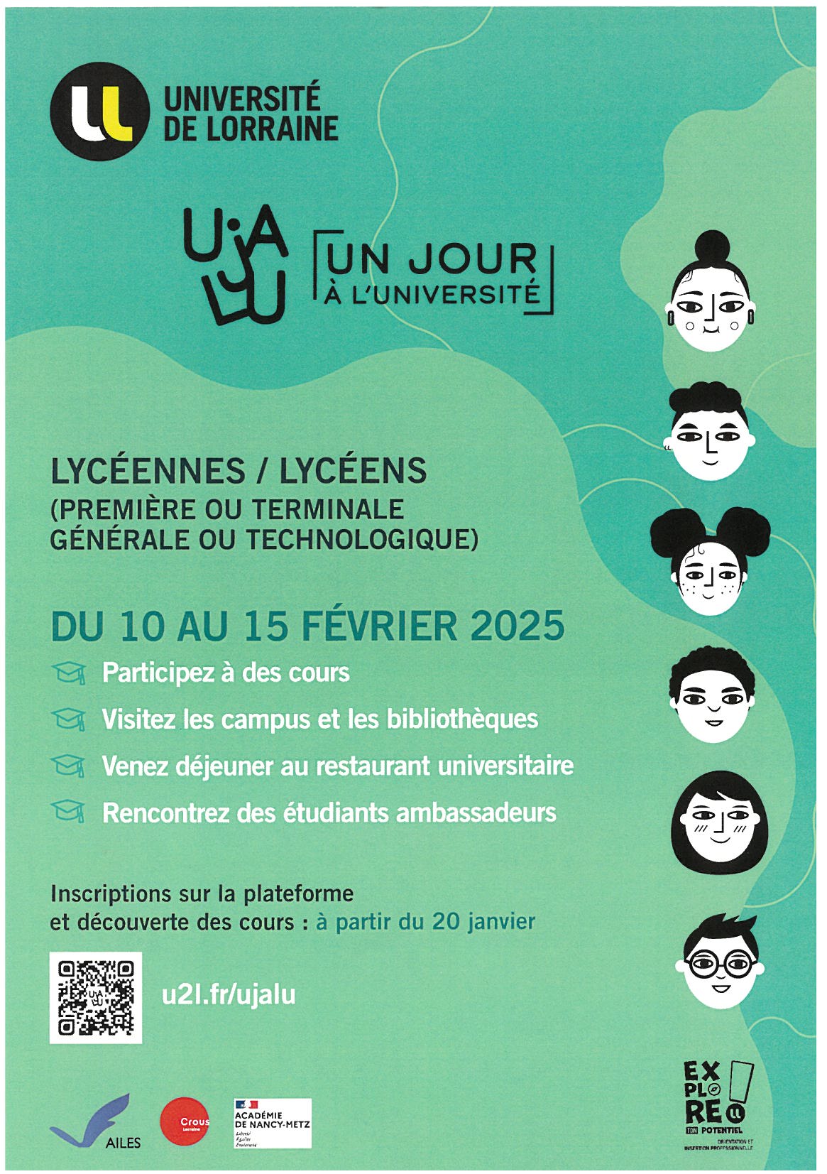L’Université de Lorraine, en partenariat avec le rectorat de l’académie Nancy-Metz, le Crous Lorraine et le projet Ailes, propose aux lycéens en terminale générale ou technologique grâce à l’opération « Un jour à l’Université » (UJALU) de se mettre dans la peau d’un étudiant le temps de quelques heures.