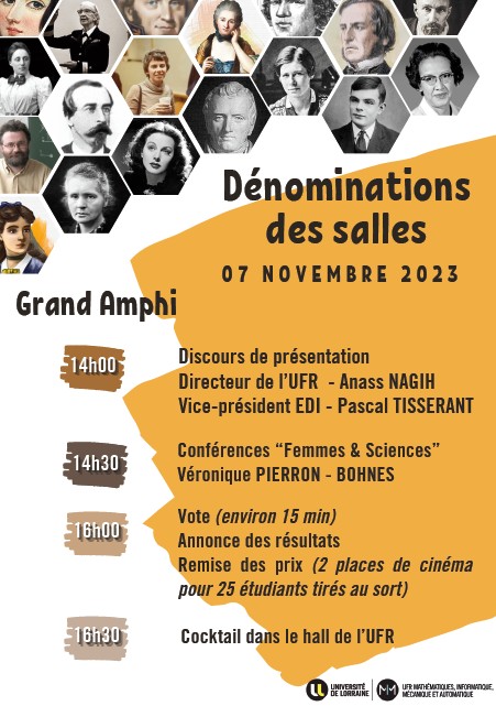 Dans le cadre d’un projet de sensibilisation à la parité femme-homme, des espaces pédagogiques du bâtiment de l’UFR MIM prendront les noms de scientifiques originaires de Lorraine ou d’ailleurs en lien avec les Mathématiques, l’Informatique et les Sciences Pour l’Ingénieur.