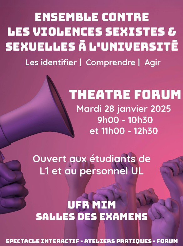 A l’initiative de la cellule EDI de l’UFR MIM, le 28 janvier 2025, en salle d’examens, une pièce de théâtre interactive sur les violences sexuelles et sexistes (VSS) sera présentée.