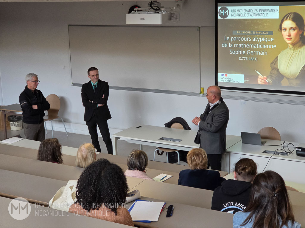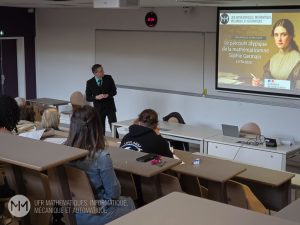 Lundi 23 mars 2026, l’UFR MIM a accueilli une conférence dédiée à Sophie Germain, mathématicienne de renom, dans l’amphithéâtre portant son nom. Organisée par la cellule Égalité, Diversité, Inclusion (EDI) de l’UFR, cette rencontre a rassemblé une partie du personnel ainsi que des étudiants en master de Mathématiques.